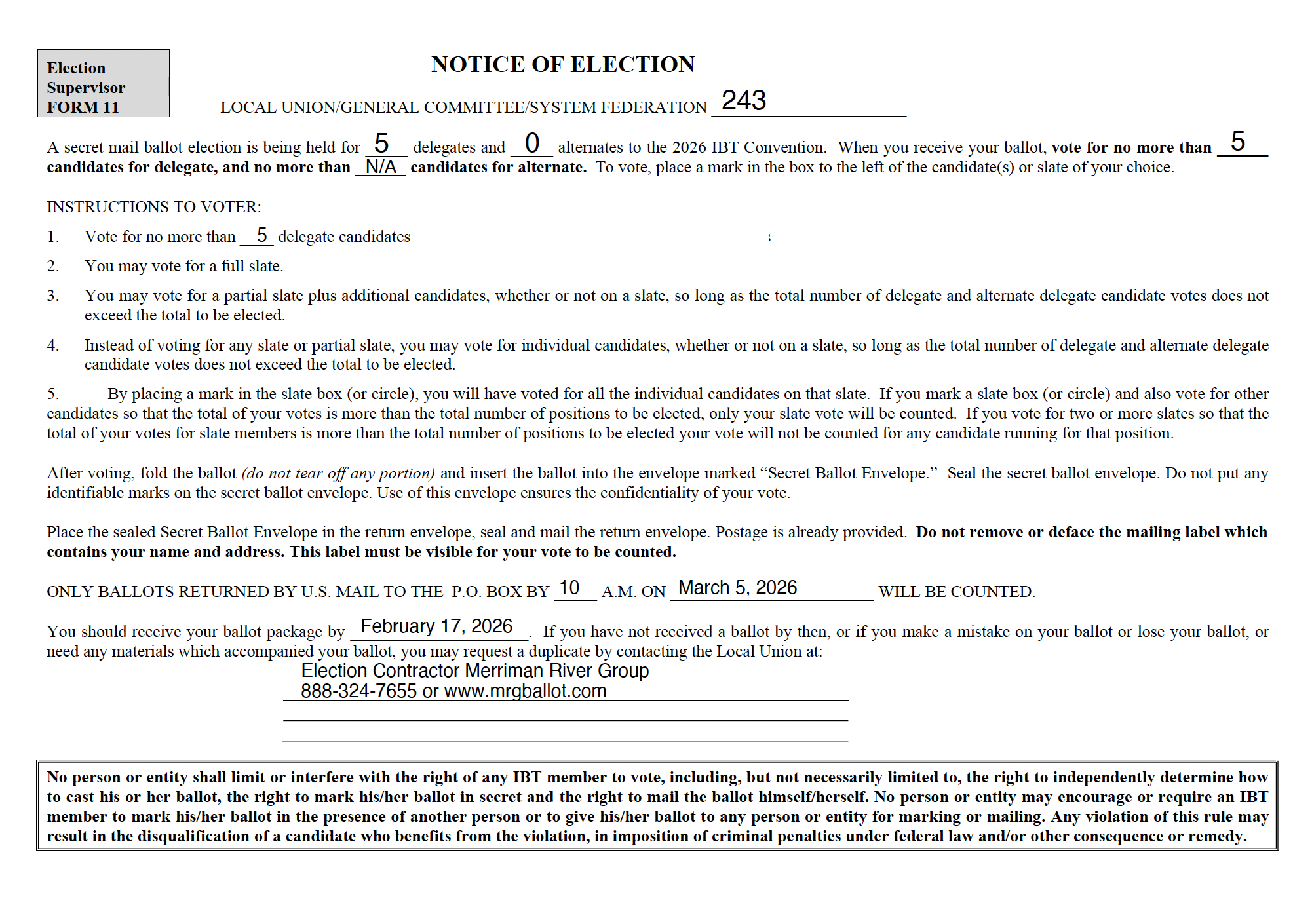 Local 243 Delegates and Alternates Nominated For the 2026 International Brotherhood of Teamsters Constitutional Convention