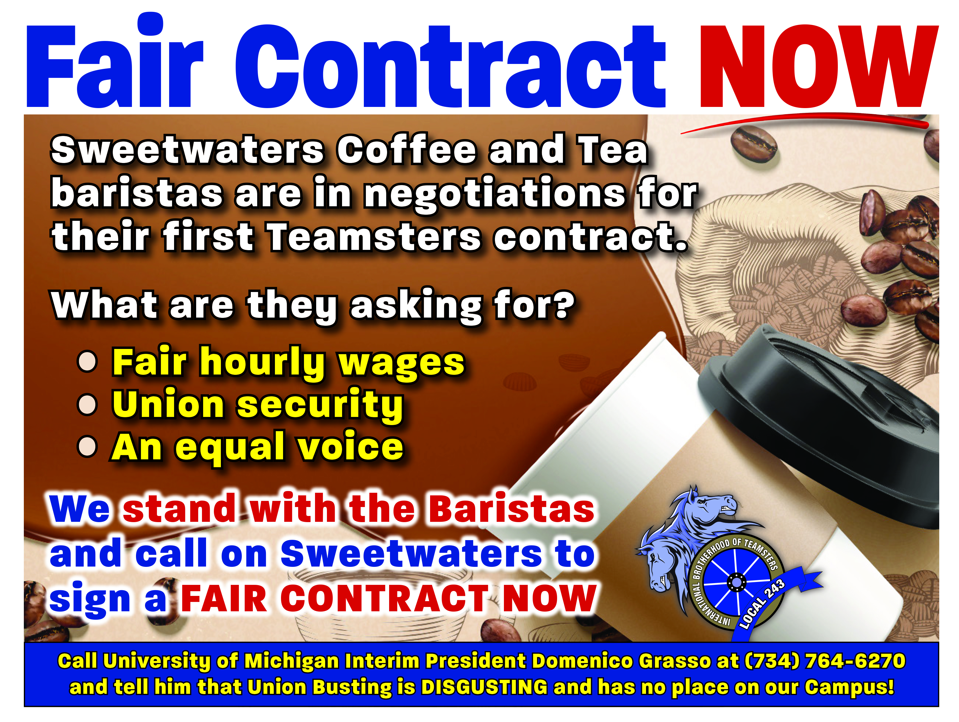 Sweetwaters Ann Arbor Workers Host “Sip In For Solidarity” To Support Organizing With Local 243Baristas at Sweetwaters Coffee & Tea held a “sip in for solidarity” on January 20, 2024 at the Company’s downtown Ann Arbor location to show support for the workers’ effort to organize with Teamsters Local 243.